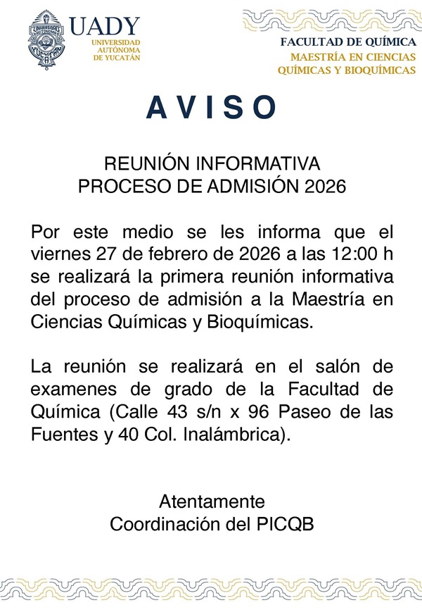 Estas Facultades y sus CA´s se benefician de la experiencia adquirida a través de la impartición de la Maestría en Ciencias Químicas (MCQ) de la FQ y, de Ciencias Alimentarias (MCA) de la FIQ para presentar de manera conjunta el Posgrado Institucional en Ciencias Químicas y Bioquímicas.