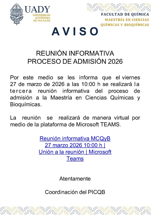 Así, este programa integra los programas de posgrado MCQ y MCA y, se fortalece con la infraestructura académica y física del Campus de Ciencias de la Salud y de Ciencias Exactas e Ingenierías, permitiendo apoyarse en sus fortalezas para aprovechar las áreas de oportunidad y enfrentar los retos presentes y futuros, de modo que se constituyan en un verdadero y efectivo polo de desarrollo científico y tecnológico con proyección nacional e internacional, que sea congruente con el Proyecto de Integración Universitaria vigente y con las políticas del Sistema de Investigación, Innovación y Desarrollo Tecnológico del Estado de Yucatán (SIIDETEY) y de esta forma ese desarrollo científico incida realmente en beneficio de nuestra región, para lograr la trascendencia social a la que se ha comprometido la UADY.